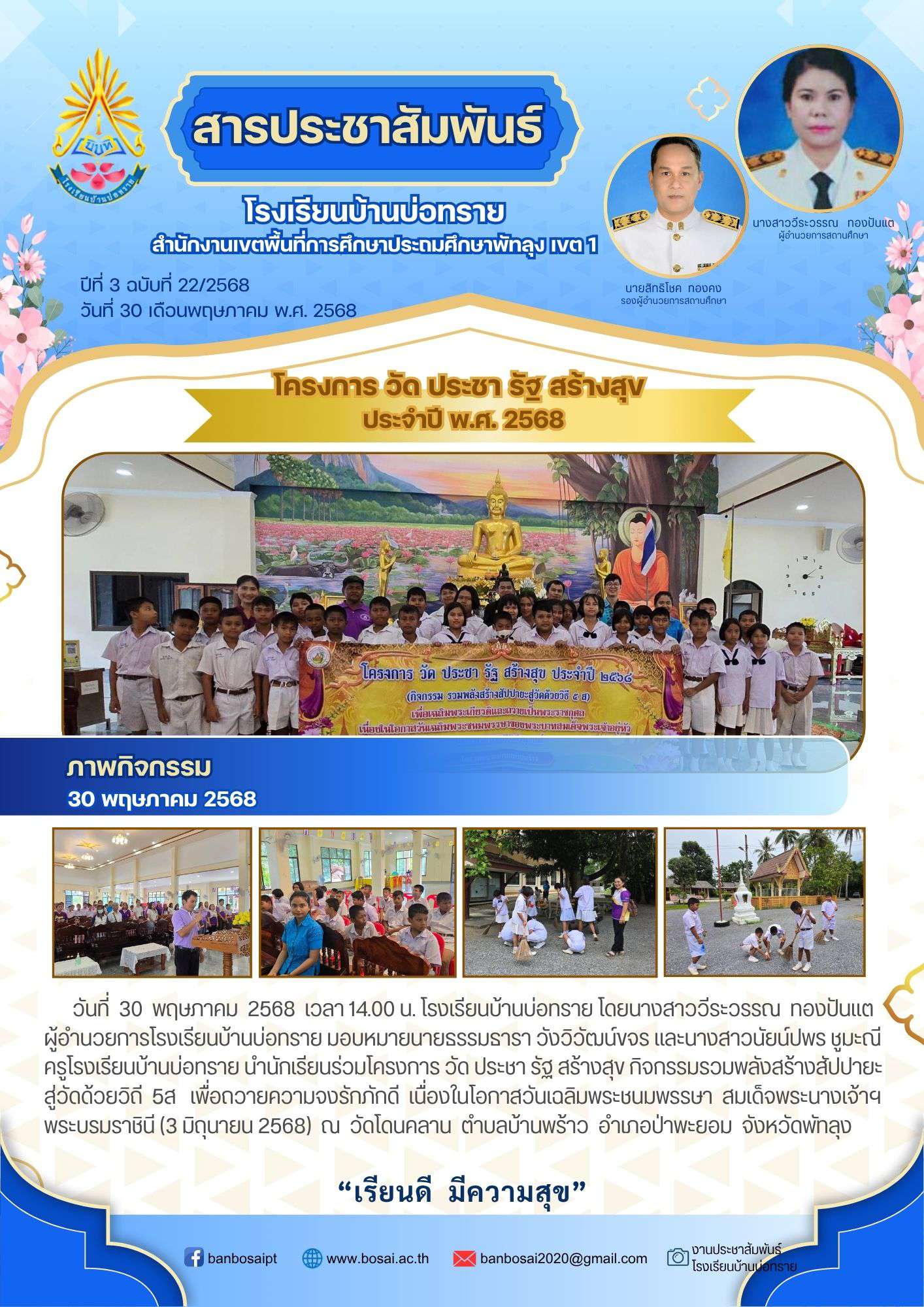 วันที่ 30 พฤษภาคม 2568 เวลา 14.00 น. โรงเรียนบ้านบ่อทราย โดยนางสาววีระวรรณ ทองปันแต ผู้อำนวยการโรงเรียนบ้านบ่อทราย มอบหมายนายธรรมธารา วังวิวัฒน์ขจร และนางสาวนัยน์ปพร ชูมะณี ครูโรงเรียนบ้านบ่อทราย นำนักเรียนร่วมโครงการ วัด ประชา รัฐ สร้างสุข กิจกรรมรวมพลังสร้างสัปปายะสู่วัดด้วยวิถี 5ส เพื่อถวายความจงรักภักดี เนื่องในโอกาสวันเฉลิมพระชนมพรรษา สมเด็จพระนางเจ้าฯ พระบรมราชินี (3 มิถุนายน 2568) ณ วัดโดนคลาน ตำบลบ้านพร้าว อำเภอป่าพะยอม จังหวัดพัทลุง