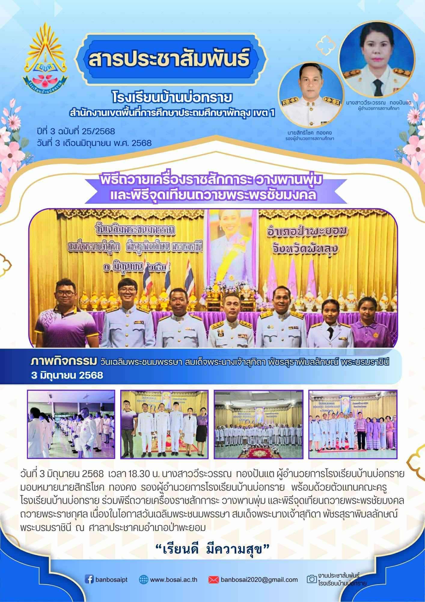 นางสาววีระวรรณ ทองปันแต ผู้อำนวยการโรงเรียนบ้านบ่อทราย และนายสิทธิโชค ทองคง รองผู้อำนวยการโรงเรียนบ้านบ่อทราย พร้อมด้วยตัวแทนคณะครูและบุคลากรโรงเรียนบ้านบ่อทราย ร่วมพิธีเจริญพระพุทธมนต์และทำบุญตักบาตรถวายพระราชกุศล และร่วมพิธีถวายเครื่องราชสักการะ วางพานพุ่ม และพิธีจุดเทียนถวายพระพรชัยมงคลถวายพระราชกุศล เนื่องในโอกาสวันเฉลิมพระชนมพรรษา สมเด็จพระนางเจ้าสุทิดา พัชรสุธาพิมลลักษณ์ พระบรมราชินี ณ ศาลาประชาคมอำเภอป่าพะยอม
