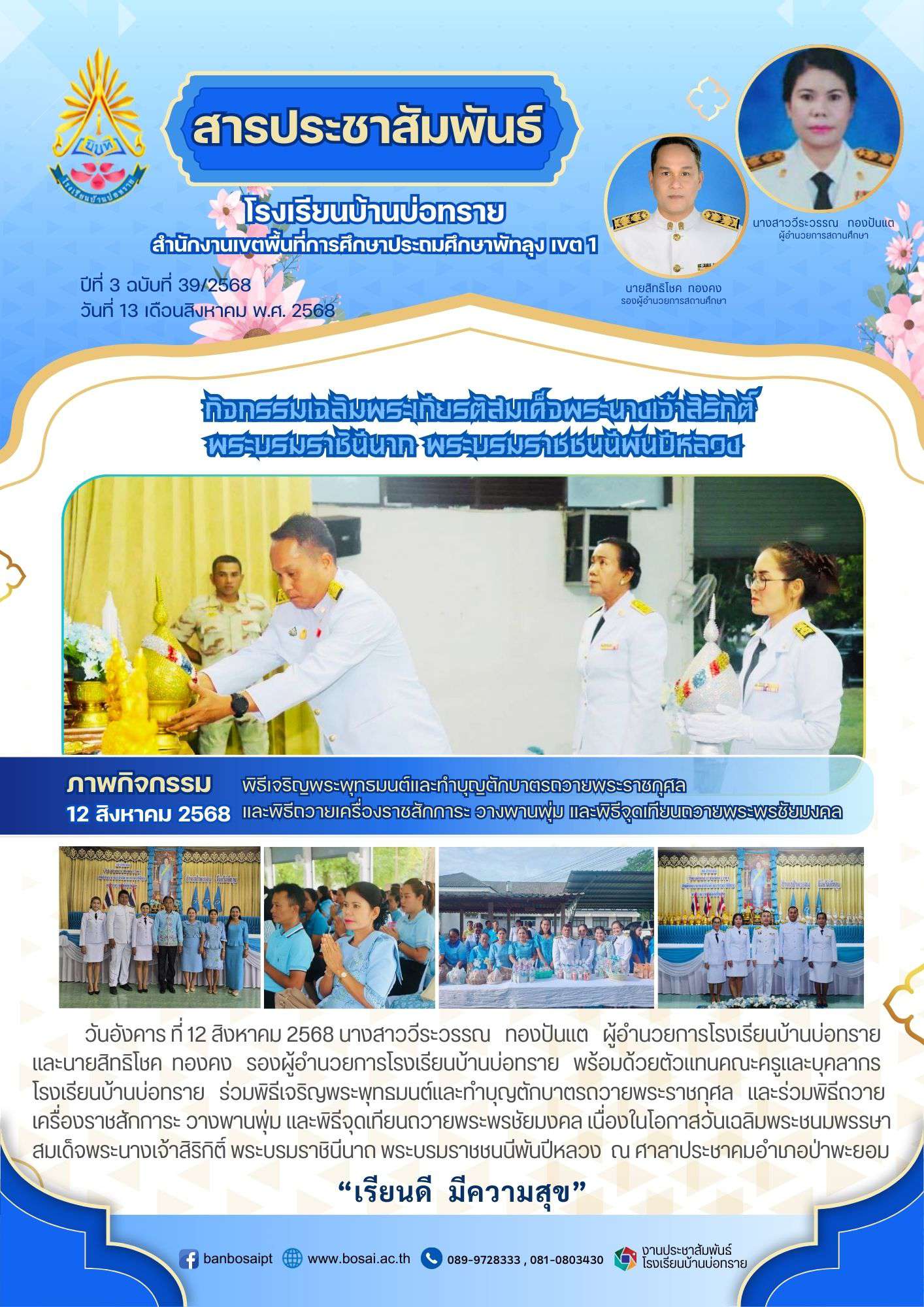 นางสาววีระวรรณ ทองปันแต ผู้อำนวยการโรงเรียนบ้านบ่อทราย และนายสิทธิโชค ทองคง รองผู้อำนวยการโรงเรียนบ้านบ่อทราย พร้อมด้วยตัวแทนคณะครูและบุคลากรโรงเรียนบ้านบ่อทราย ร่วมพิธีเจริญพระพุทธมนต์และทำบุญตักบาตรถวายพระราชกุศล และร่วมพิธีถวายเครื่องราชสักการะ วางพานพุ่ม และพิธีจุดเทียนถวายพระพรชัยมงคล เนื่องในโอกาสวันเฉลิมพระชนมพรรษา สมเด็จพระนางเจ้าสิริกิติ์ พระบรมราชินีนาถ พระบรมราชชนนีพันปีหลวง ณ ศาลาประชาคมอำเภอป่าพะยอม