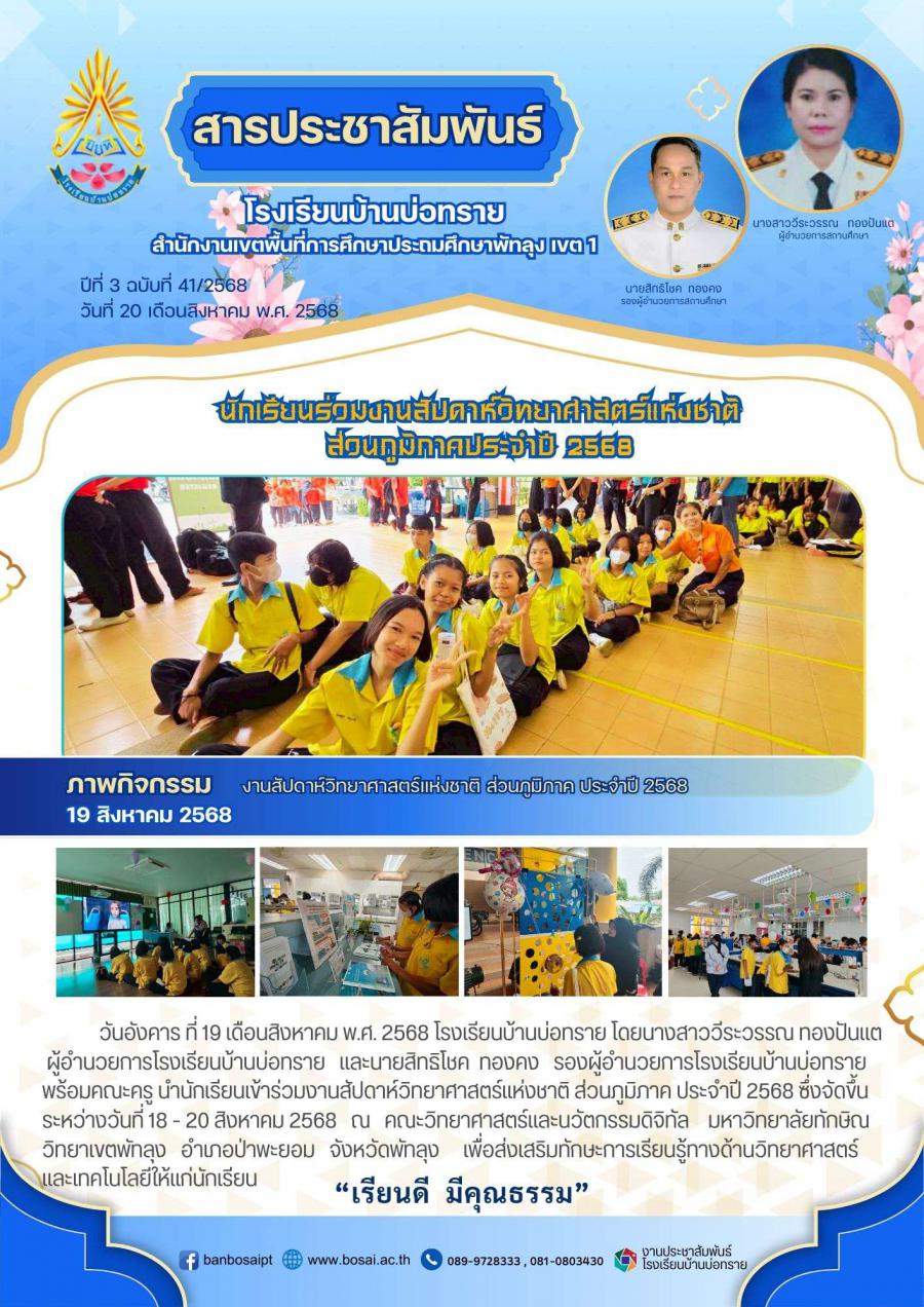 วันอังคาร ที่ 19 เดือนสิงหาคม พ.ศ. 2568 โรงเรียนบ้านบ่อทราย โดยนางสาววีระวรรณ ทองปันแต ผู้อำนวยการโรงเรียนบ้านบ่อทราย และนายสิทธิโชค ทองคง รองผู้อำนวยการโรงเรียนบ้านบ่อทราย พร้อมคณะครู นำนักเรียนเข้าร่วมงานสัปดาห์วิทยาศาสตร์แห่งชาติ ส่วนภูมิภาค ประจำปี 2568 ซึ่งจัดขึ้นระหว่างวันที่ 18-20 สิงหาคม 2568 ณ คณะวิทยาศาสตร์และนวัตกรรมดิจิทัล มหาวิทยาลัยทักษิณ วิทยาเขตพัทลุง อำเภอป่าพะยอม จังหวัดพัทลุง เพื่อส่งเสริมทักษะการเรียนรู้ทางด้านวิทยาศาสตร์ และเทคโนโลยีให้แก่นักเรียน