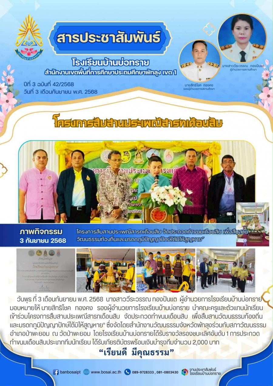 นางสาววีระวรรณ ทองปันแต ผู้อำนวยการโรงเรียนบ้านบ่อทราย มอบหมายให้ นายสิทธิโชค ทองคง รองผู้อำนวยการโรงเรียนบ้านบ่อทราย นำคณะครูและตัวแทนนักเรียนเข้าร่วมโครงการสืบสานประเพณีสารทเดือนสิบ จัดประกวดทำขนมเดือนสิบ เพื่อสืบสานวัฒนธรรมท้องถิ่นและมรดกภูมิปัญญาปักษ์ใต้มิให้สูญหาย ซึ่งจัดโดยสำนักงานวัฒนธรรมจังหวัดพัทลุงร่วมกับสภาวัฒนธรรม อำเภอป่าพะยอม ณ วัดป่าพะยอม โดยโรงเรียนบ้านบ่อทรายได้รับรางวัลรองชนะเลิศอันดับ 1 การประกวด ทำขนมเดือนสิบประเภททีมนักเรียน ได้รับเกียรติบัตรพร้อมเงินบำรุงทีม จำนวน 2,000 บาท