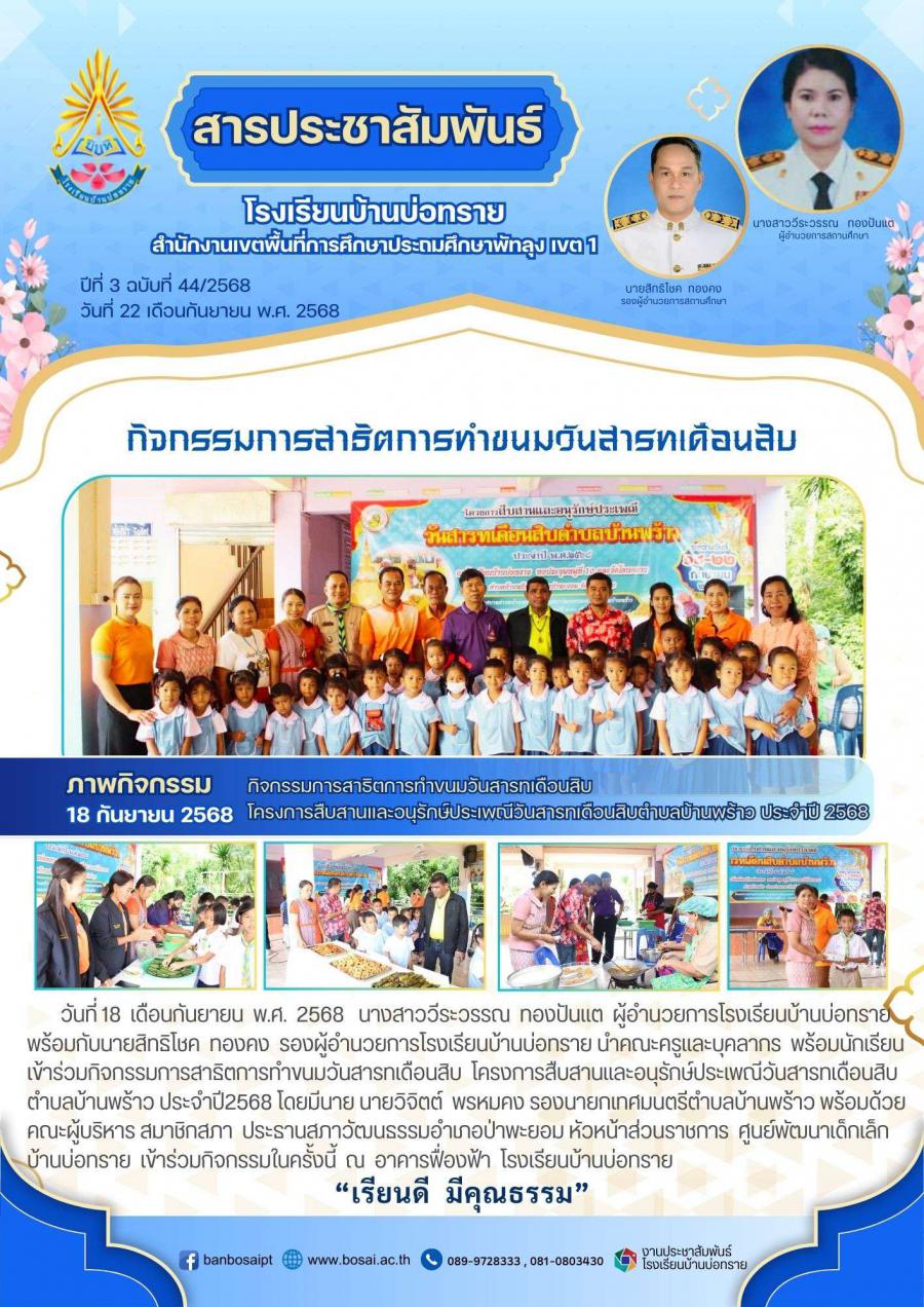 นางสาววีระวรรณ ทองปันแต ผู้อำนวยการโรงเรียนบ้านบ่อทราย พร้อมกับนายสิทธิโชค ทองคง รองผู้อำนวยการโรงเรียนบ้านบ่อทราย นำคณะครูและบุคลากร พร้อมนักเรียน เข้าร่วมกิจกรรมการสาธิตการทำขนมวันสารทเดือนสิบ โครงการสืบสานและอนุรักษ์ประเพณีวันสารทเดือนสิบตำบลบ้านพร้าว ประจำปี 2568 โดยมีนายวิจิตต์ พรหมคง รองนายกเทศมนตรีตำบลบ้านพร้าว พร้อมด้วยคณะผู้บริหาร สมาชิกสภา ประธานสภาวัฒนธรรมอำเภอป่าพะยอม หัวหน้าส่วนราชการ ศูนย์พัฒนาเด็กเล็กบ้านบ่อทราย เข้าร่วมกิจกรรมในครั้งนี้ ณ อาคารเฟื่องฟ้า โรงเรียนบ้านบ่อทราย