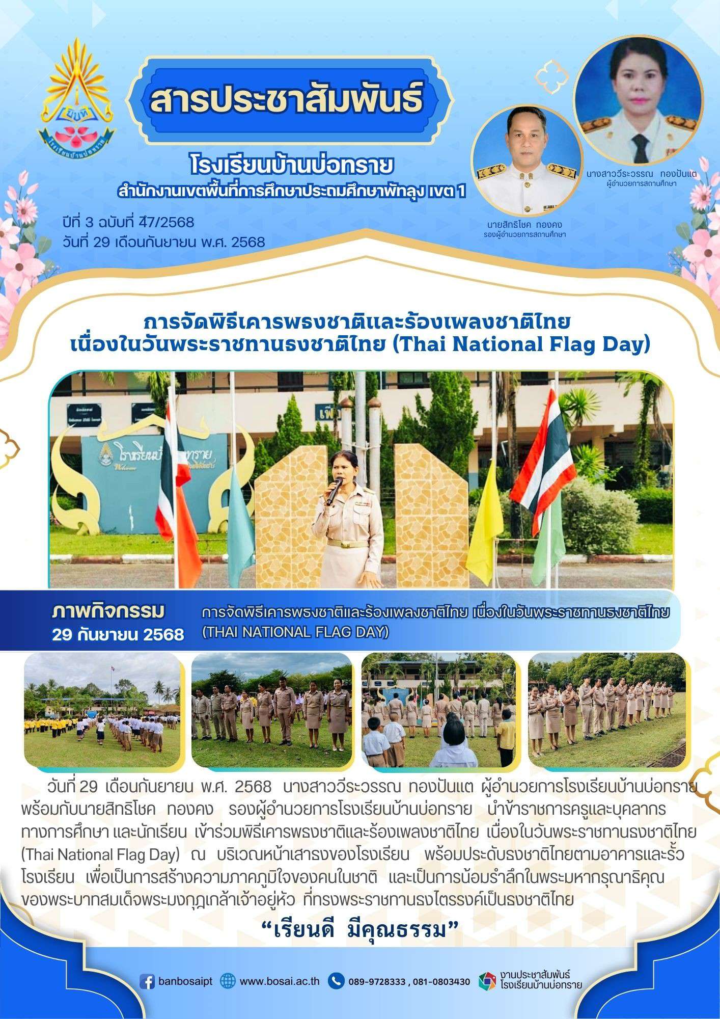 นางสาววีระวรรณ ทองปันแต ผู้อำนวยการโรงเรียนบ้านบ่อทราย พร้อมกับนายสิทธิโชค ทองคง รองผู้อำนวยการโรงเรียนบ้านบ่อทราย นำข้าราชการครูและบุคลากรทางการศึกษา และนักเรียน เข้าร่วมพิธีเคารพธงชาติและร้องเพลงชาติไทย เนื่องในวันพระราชทานธงชาติไทย (Thai National Flag Day) ณ บริเวณหน้าเสาธงของโรงเรียน พร้อมประดับธงชาติไทยตามอาคารและรั้วโรงเรียน เพื่อเป็นการสร้างความภาคภูมิใจของคนในชาติและเป็นการน้อมรำลึกในพระมหากรุณาธิคุณของพระบาทสมเด็จพระมงกุฎเกล้าเจ้าอยู่หัวที่ทรงพระราชทานธงไตรรงค์เป็นธงชาติไทย