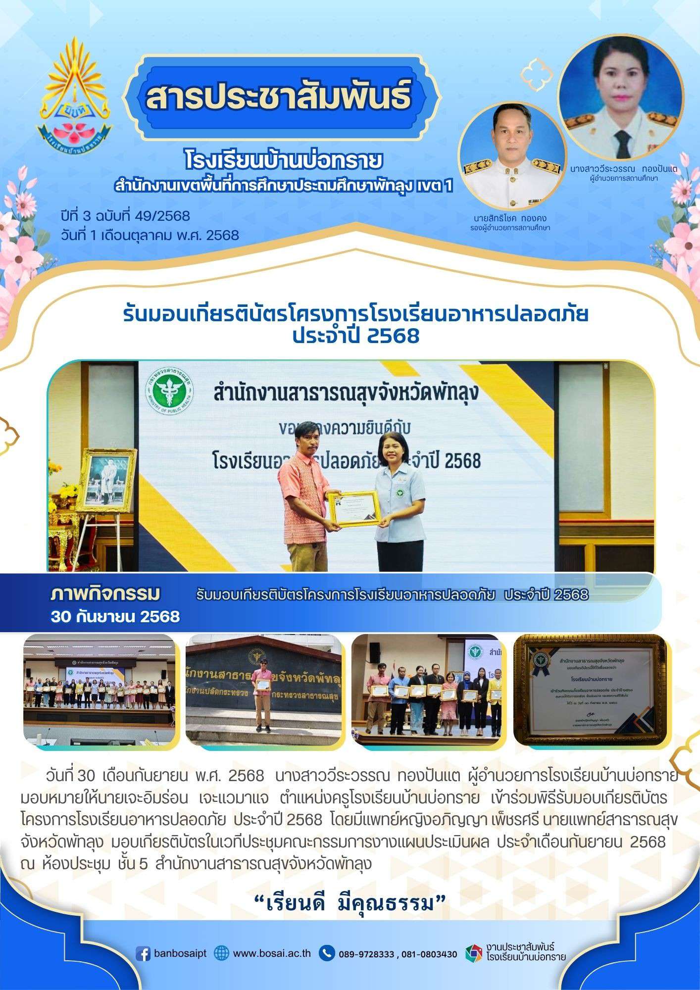 นางสาววีระวรรณ ทองปันแต ผู้อำนวยการโรงเรียนบ้านบ่อทราย มอบหมายให้นายเจะอิมร่อน เจะแวมาแจ ตำแหน่งครูโรงเรียนบ้านบ่อทราย เข้าร่วมพิธีรับมอบเกียรติบัตรโครงการโรงเรียนอาหารปลอดภัย ประจำปี 2568 โดยมีแพทย์หญิงอภิญญา เพ็ชรศรี นายแพทย์สาธารณสุขจังหวัดพัทลุง มอบเกียรติบัตรในเวทีประชุมคณะกรรมการงางแผนประเมินผล ประจำเดือนกันยายน 2568 ณ ห้องประชุม ชั้น 5 สำนักงานสาธารณสุขจังหวัดพัทลุง