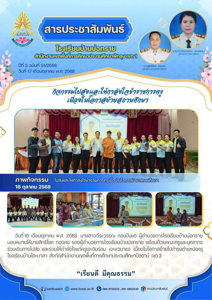 นางสาววีระวรรณ ทองปันแต ผู้อำนวยการโรงเรียนบ้านบ่อทราย มอบหมายให้นายสิทธิโชค ทองคง รองผู้อำนวยการโรงเรียนบ้านบ่อทราย พร้อมด้วยคณะครูและบุคลากรร่วมเดินทางไปส่งและร่วมให้กำลังใจแก่ครูเจะอิมร่อน เจะแวมาแจ เนื่องในโอกาสย้ายไปดำรงตำแหน่งครูโรงเรียนบ้านโตะบาลา อำเภอสายบุรี จังหวัดปัตตานี สังกัดสำนักงานเขตพื้นที่การศึกษาประถมศึกษาปัตตานี เขต 3