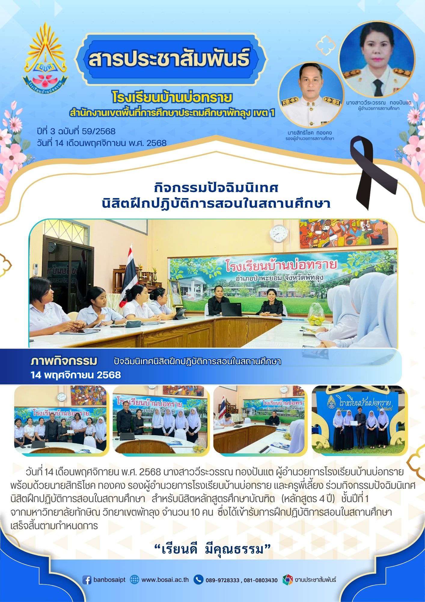 นางสาววีระวรรณ ทองปันแต ผู้อำนวยการโรงเรียนบ้านบ่อทราย พร้อมด้วยนายสิทธิโชค ทองคง รองผู้อำนวยการโรงเรียนบ้านบ่อทราย และครูพี่เลี้ยง ร่วมกิจกรรมปัจฉิมนิเทศนิสิตฝึกปฏิบัติการสอนในสถานศึกษา สำหรับนิสิตหลักสูตรศึกษาบัณฑิต (หลักสูตร 4 ปี) ชั้นปีที่ 1 จากมหาวิทยาลัยทักษิณ วิทยาเขตพัทลุง จำนวน 10 คน ซึ่งได้เข้ารับการฝึกปฏิบัติการสอนในสถานศึกษาเสร็จสิ้นตามกำหนดการ