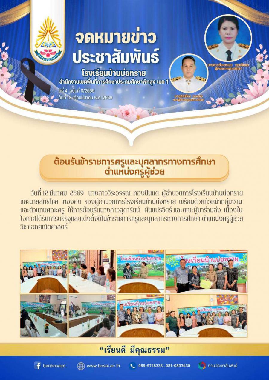 การต้อนรับนางสาวสุดารัตน์ ผันแปรจิตร์ เนื่องในโอกาสได้รับการบรรจุและแต่งตั้งเป็นข้าราชการครูและบุคลากรทางการศึกษา ตำแหน่งครูผู้ช่วย วิชาเอกคณิตศาสตร์